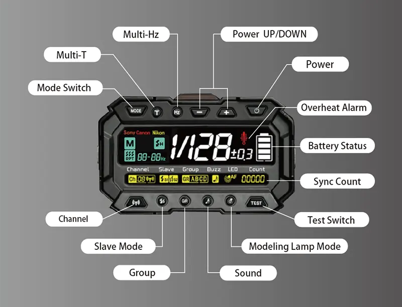 | マルチ発光 | Sony/Canon/Nikon:発光回数(T)1~99回 発光周波数(Hz)1~99Hz Fuji:発光回数(T)2~90回 発光周波数(Hz)1~90Hz |