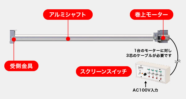 巻上モーターにスイッチボックスを組み合わせ、電源のON/OFFやロールスクリーンのアップ/ダウンを手元で操作します。