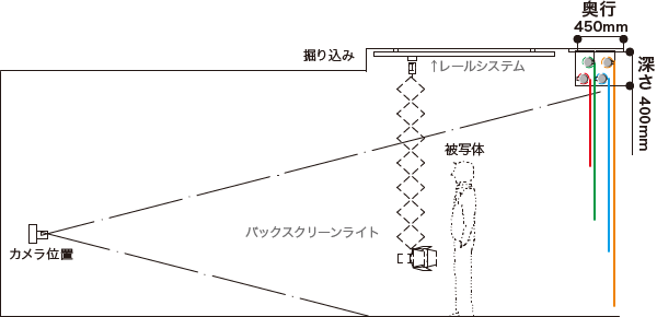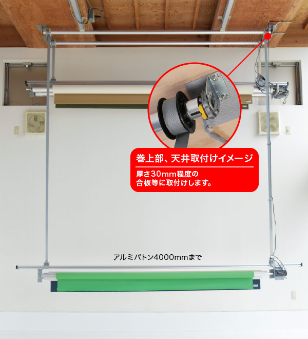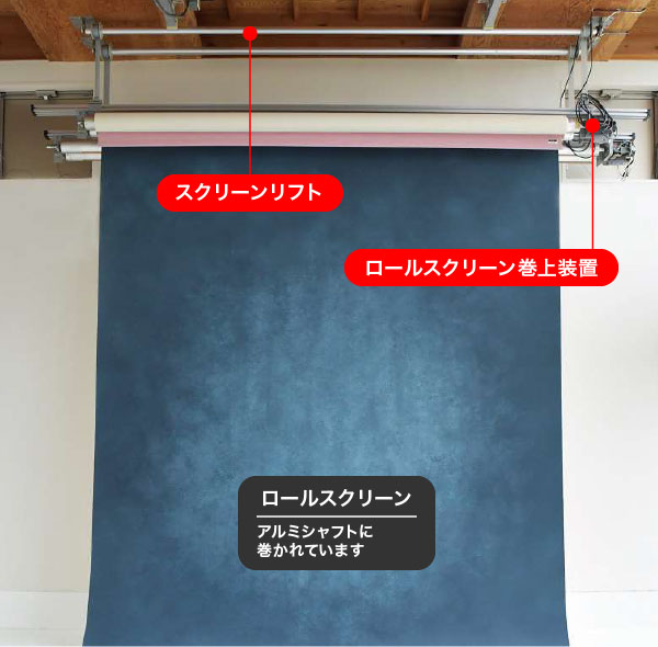 天井に専用金具を設置し巻上機を取付け、ロールスクリーンを上下させる装置です。撮影スタジオの広さや高さに応じてスクリーンの本数、動作方式(手動/自動)などのシステムを選択できます。数多くのスタジオ・写真館・結婚式場などで採用いただいている、最も基本的なシステムです。